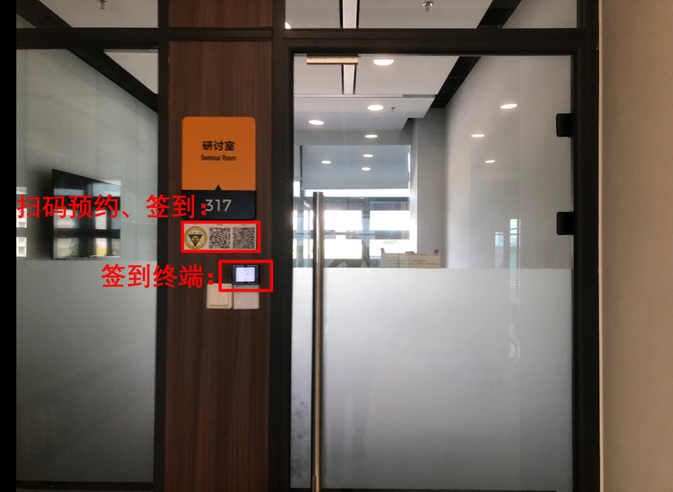 a) 线下一卡通或手机nfc刷卡签到,到相应房间门口,将一卡通或手机nfc靠近签到终端,即完成签到并开门。房间门口签到设备如下图所示。