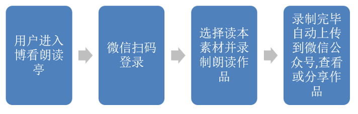 读者根据登录页面的二维码,用微信扫码登录后,可以选择喜欢的读本。读者点击读本详情页的“开始朗读”,即可录制朗读作品。读者可在录制作品页面调节麦克风、背景音乐、文字滚动速度等常用操作。在录制过程中,读者可随时暂停录制,以确保朗读作品的质量和音频的正确采集。录制完毕后,点击录制作品页的“结束录制”按钮,即可进入评分页面。点击“保存上传”即可上传朗读作品到博看朗读亭的微信公众号。